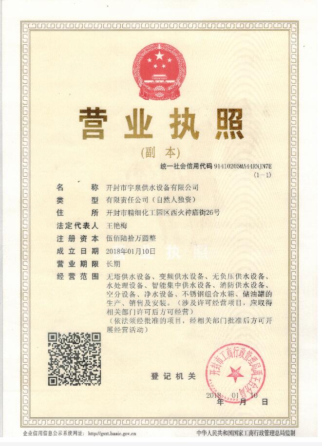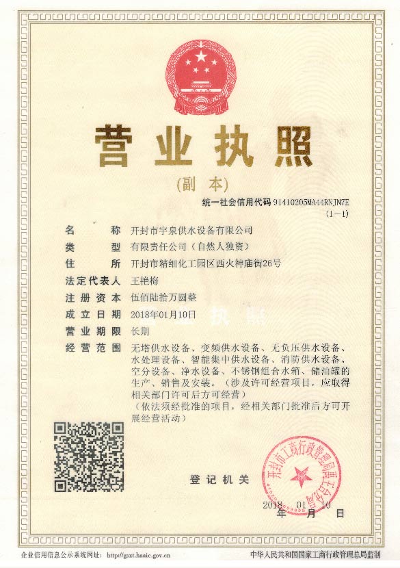 版權(quán)所有:開(kāi)封市宇泉供水設(shè)備有限公司     豫ICP備19046338號(hào)-1     營(yíng)業(yè)執(zhí)照公示
